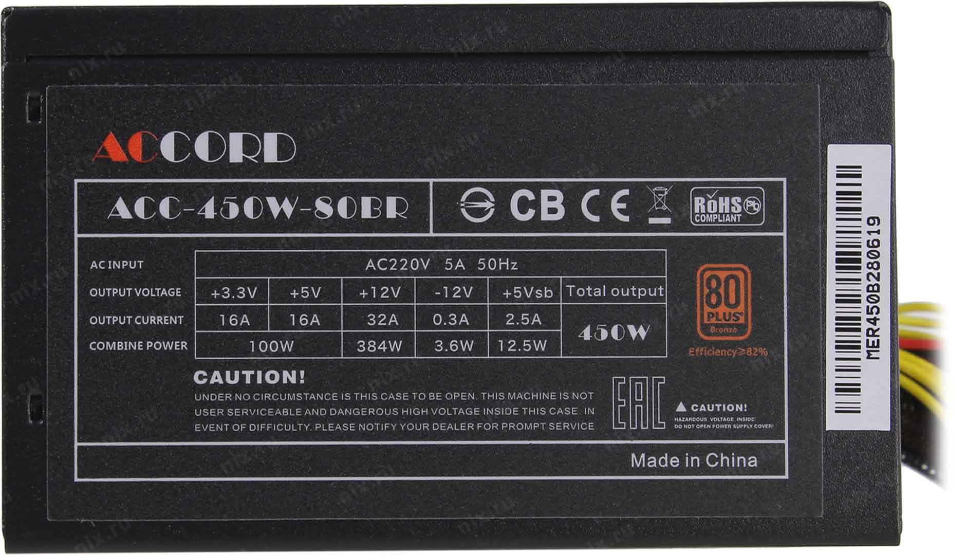 -Блок питания Accord ACC-450W-80BR (450W, 6xSATA, 2xMOLEX, 1xPCI-E(6+2), 1xFDD, 120mm, APFC, 80+ Bronze)