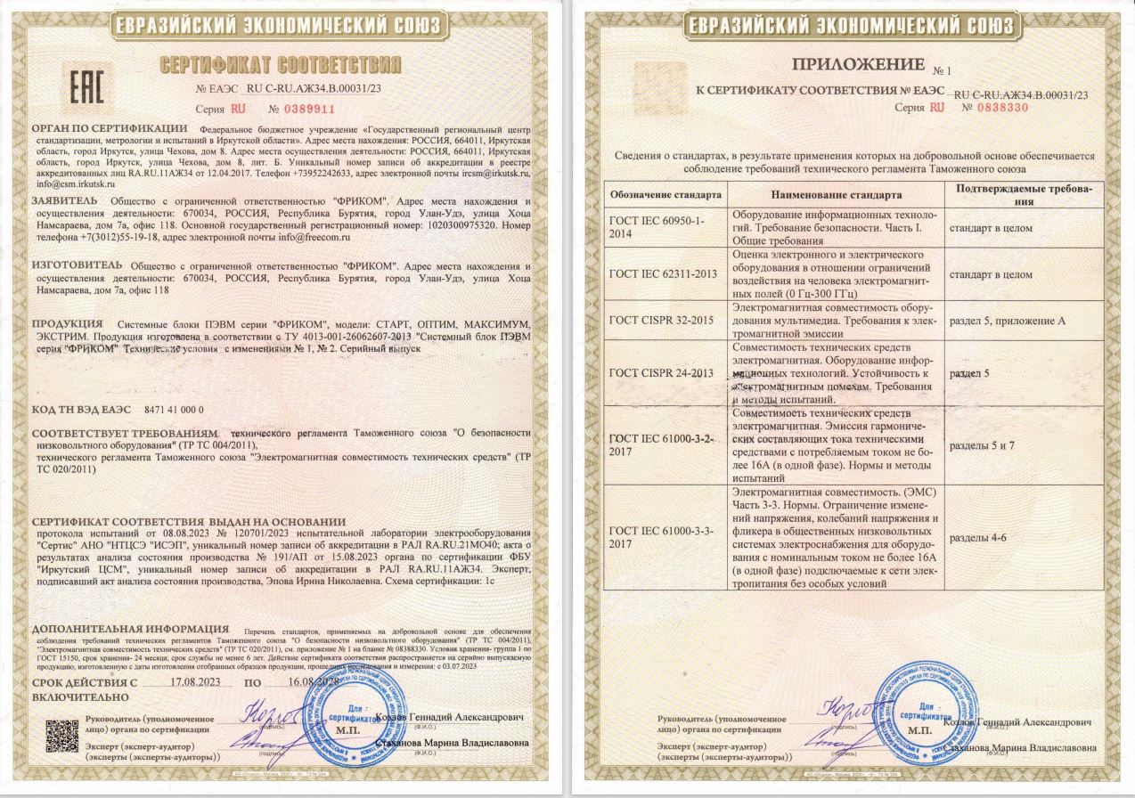 Системные блоки ФРИКОМ проходят обязательную сертификацию на соответствие Техническим регламентам Таможенного союза (Сертификат Евразийского экономического союза № ЕАЭС RU C-RU.АЖ34.Вю00031\23)